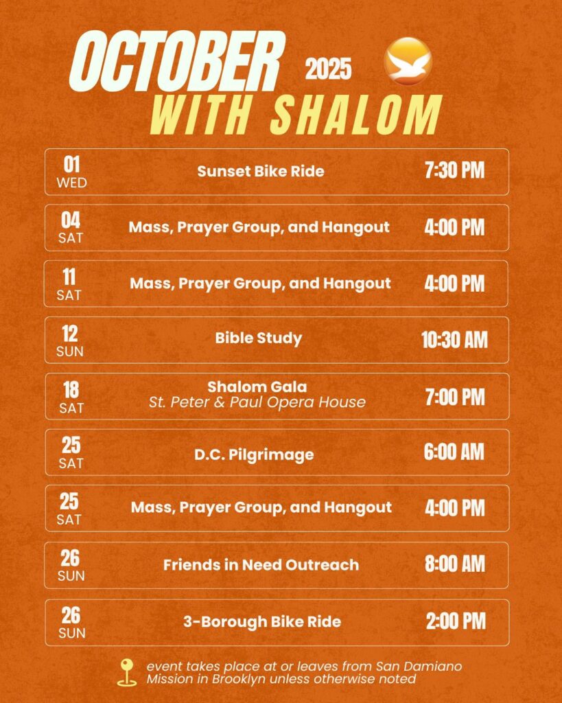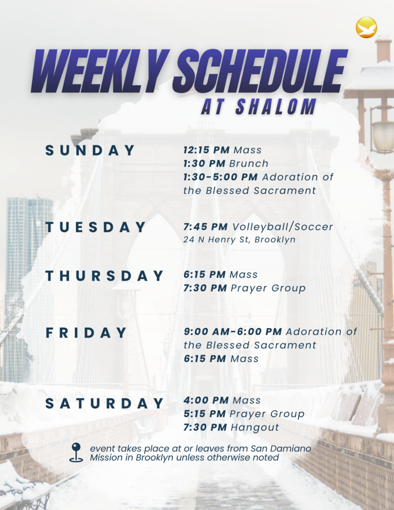 Every Saturday the Shalom Catholic Community hosts an open prayer group for young adults at 5:15pm. The purpose of this group is to grow in prayer and community support to deepen one’s relationship with God through His Word.