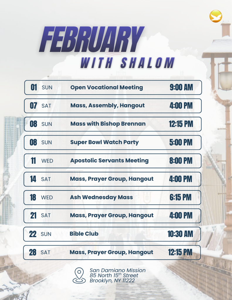 Our doors are open to all! We offer Holy Mass, Adoration, Praise and Worship Nights, and many other activities to foster unity and community. Our church is part of the Diocese of Brooklyn and since October 2020, is directed by missionaries from the Shalom Catholic Community, an International Association of Faithful recognized by the Holy See. We seek to offer to all the experience of the Risen Christ who passed through the Cross.