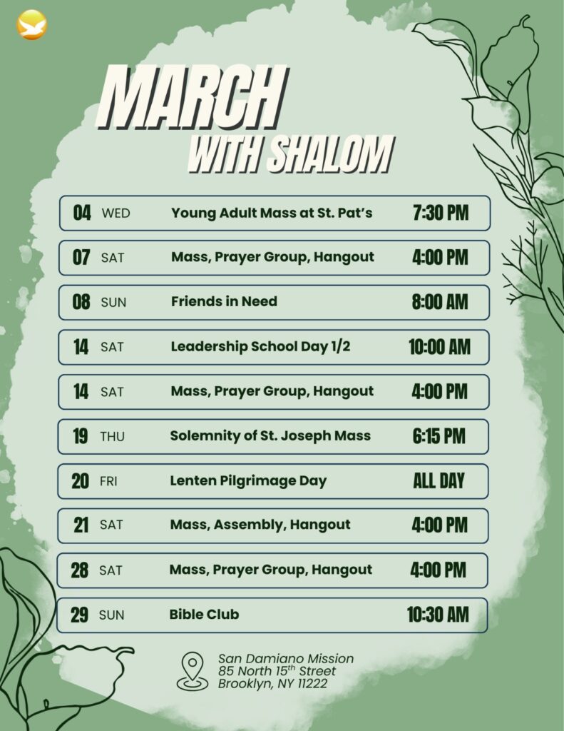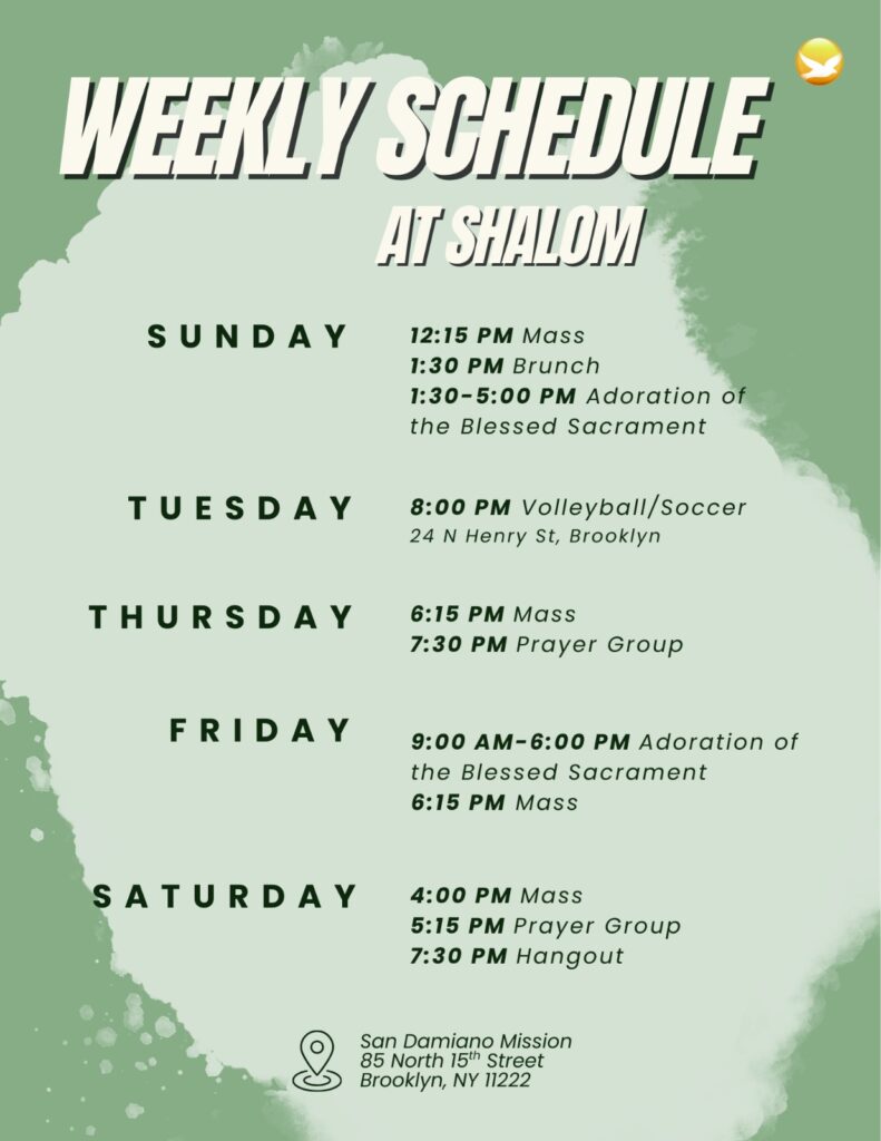 Every Saturday the Shalom Catholic Community hosts an open prayer group for young adults at 5:15pm. The purpose of this group is to grow in prayer and community support to deepen one’s relationship with God through His Word.